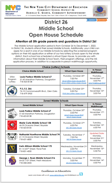 The DOE will be hosting virtual information sessions about applying to middle school, and District 26 is offering Open Houses, with opportunities for Gr5 families to attend a virtual information session followed by an in-person walkthrough for each of our middle schools.