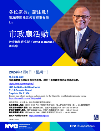 Join on Monday, January 8 6:30 to 7:30 PM at Middle School 74 (61-15 Oceania Street, Bayside) or via live stream. Register to attend online or in person at https://learndoe.org/cec/.